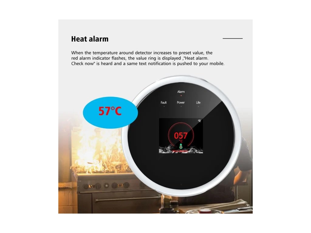 ✅ Dvojí ochrana – Detekce úniku plynu i přehřátí (nad 57°C)